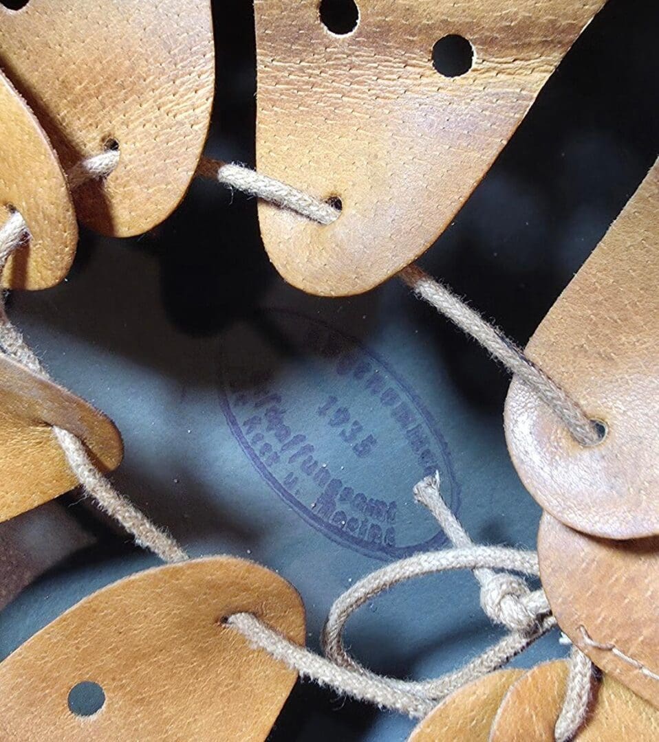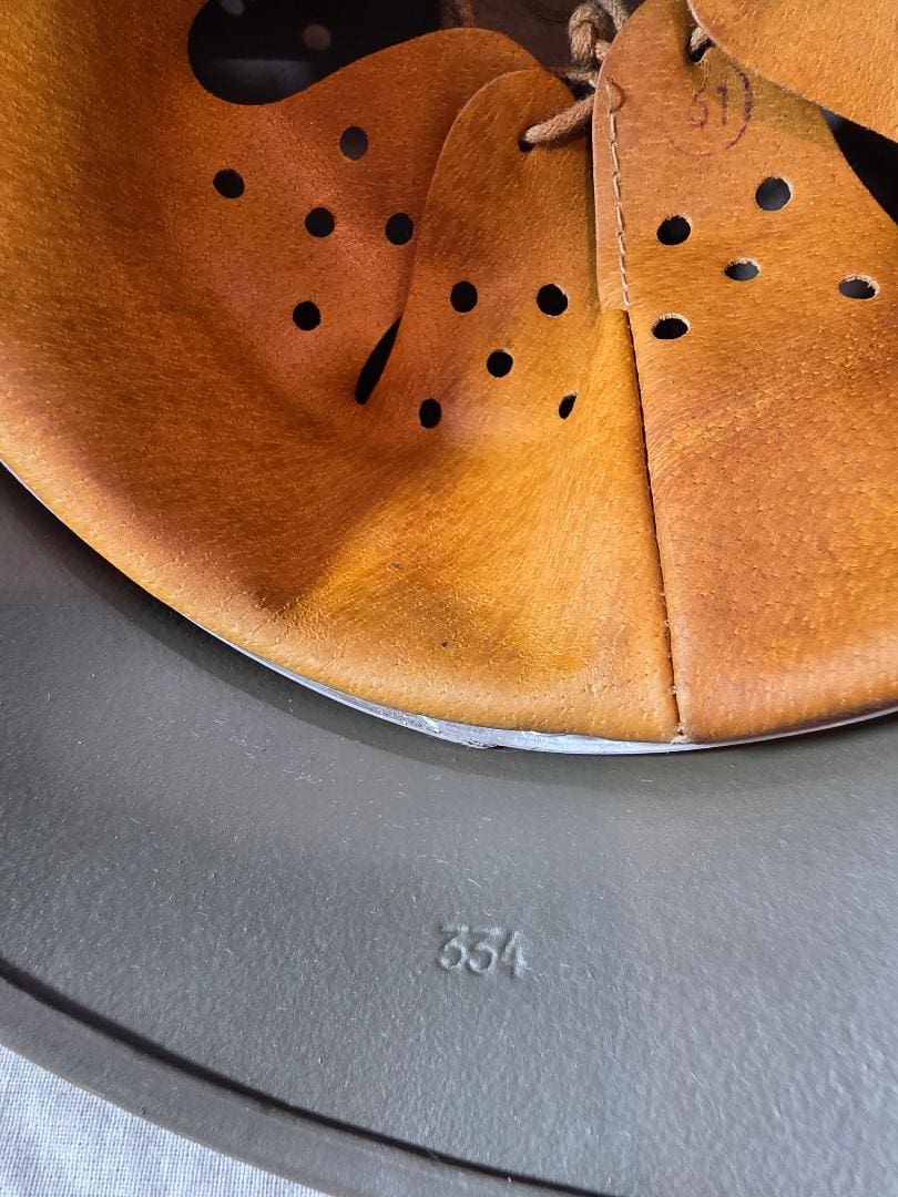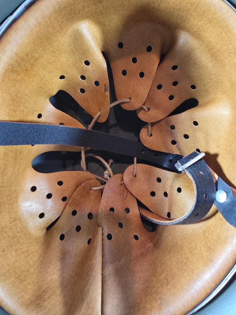 The helmet comes fit with a museum quality aluminum liner and chinstrap with aluminum hardware. The liner has been set with the proper brass split pins and slotted washers.