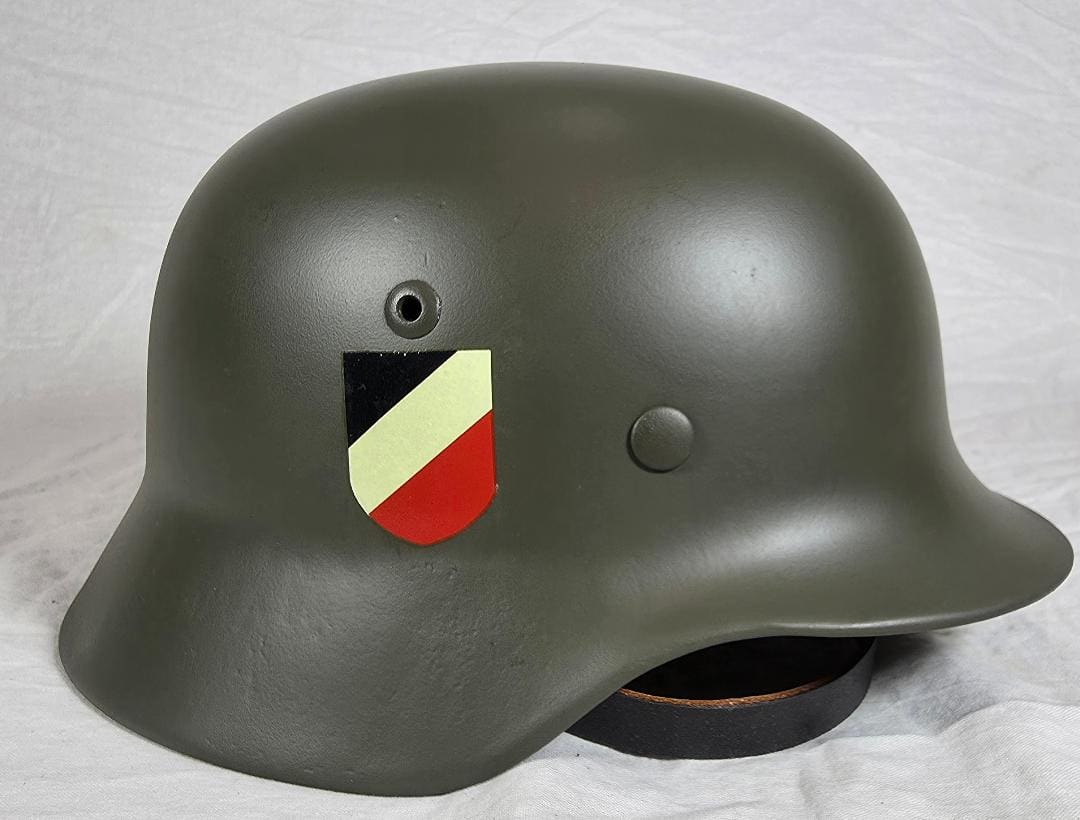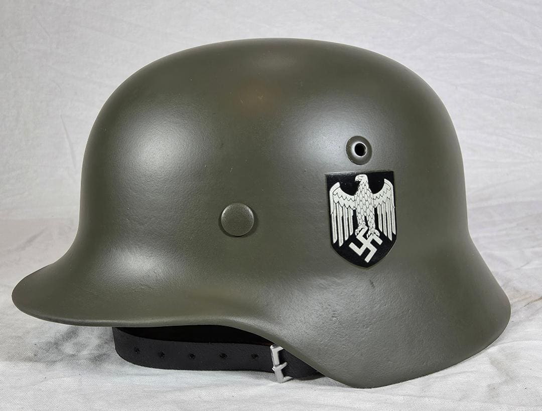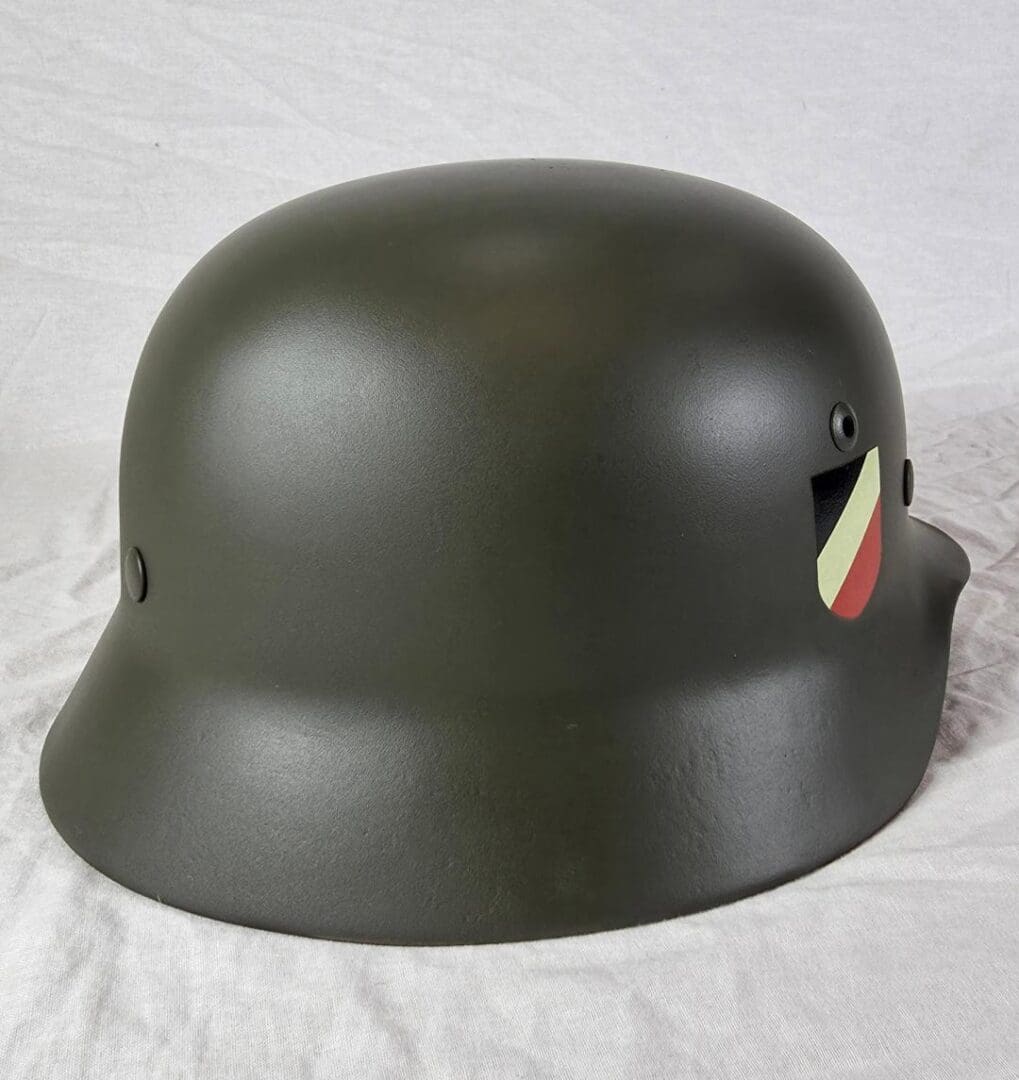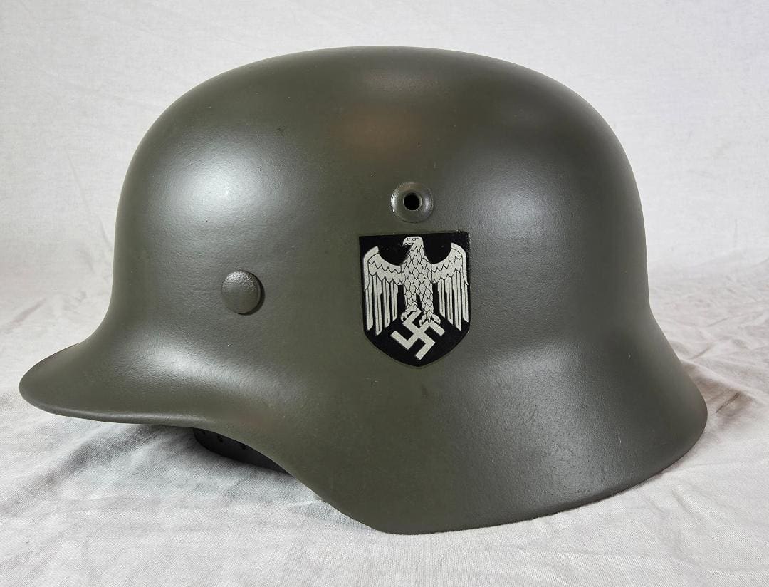 Original restored German double decal in size 68/61. Fully repainted apple green and fit with the proper Heer and national colors decal. The shell is early 1935 production and made by Sachsishe Emaillerwerke, Lauter