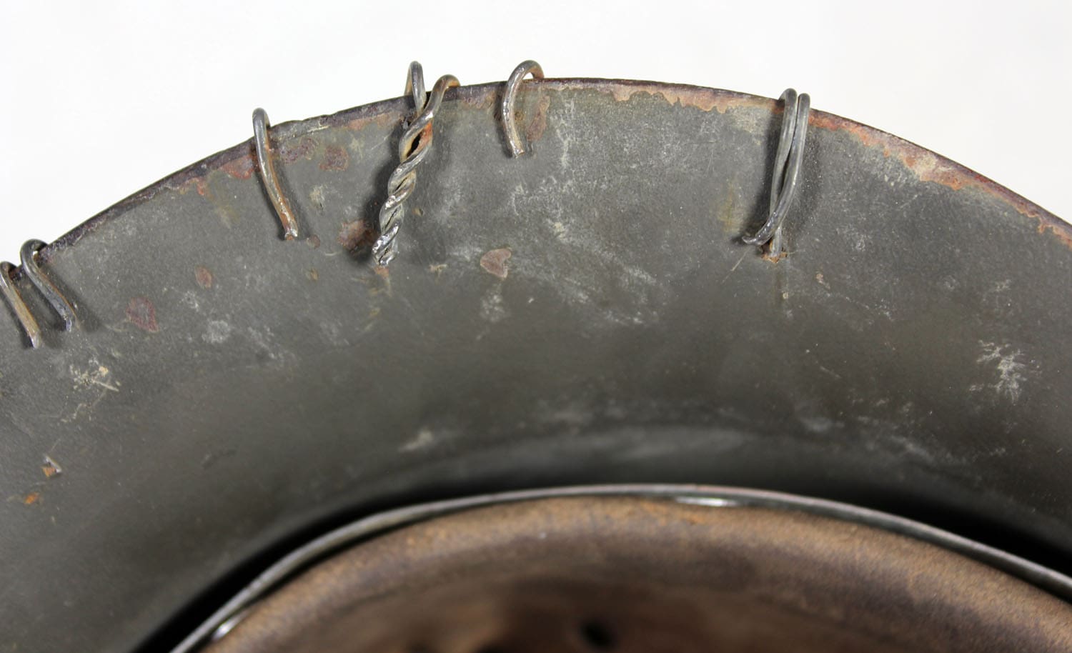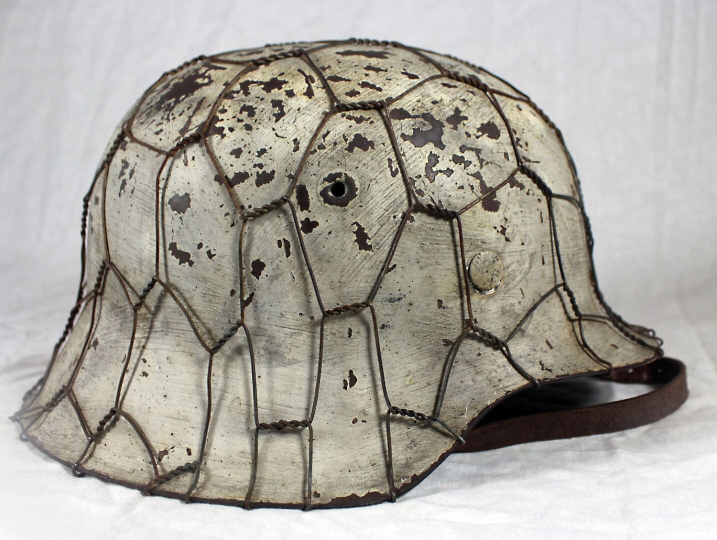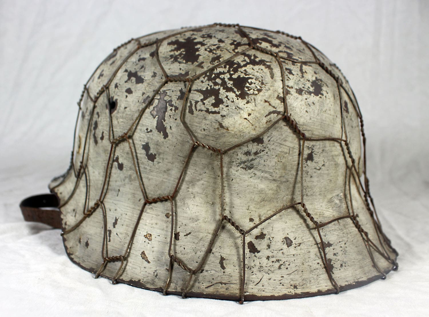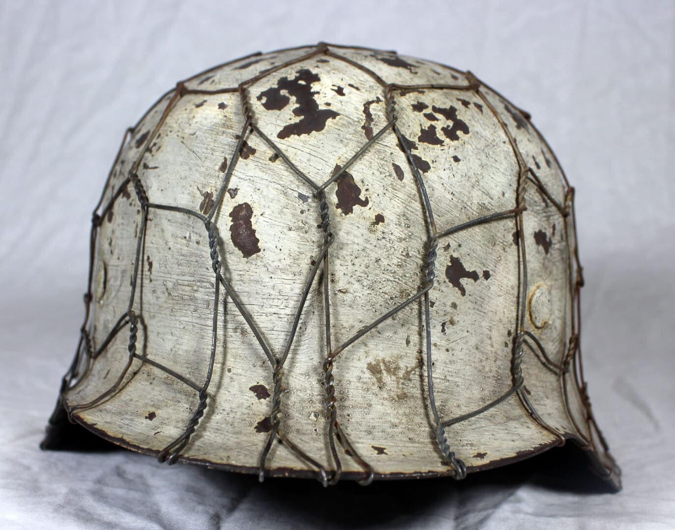 The helmet was fully stripped of post-war paint then repainted the correct shade of aluminum oxide textured field gray. The helmet was then fit with the proper war time steel liner, and 1944 dated split pins. The helmet’s chinstrap has original hardware and is RB marked. The restoration is meant to reflect the last winter campaigns of WWII such as the Ardennes or Bastogne. The snow camo was sloppily applied using a worn-out paint brush. The brush strokes are quite evident. A five-twist farm wire basket was then installed onto the helmet which would have allowed for pine needles or bits of cloth to be woven into the hexes for further camouflage.