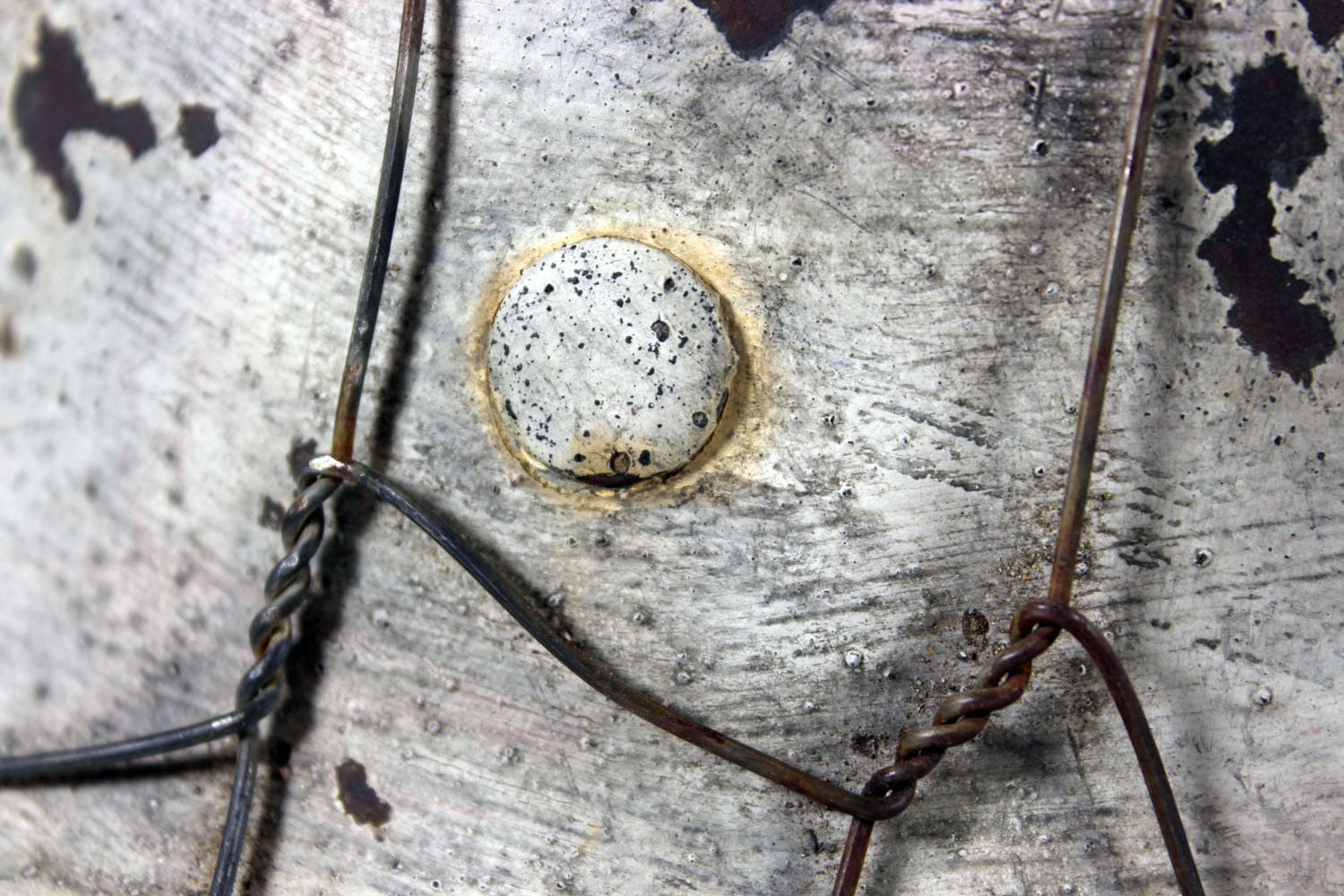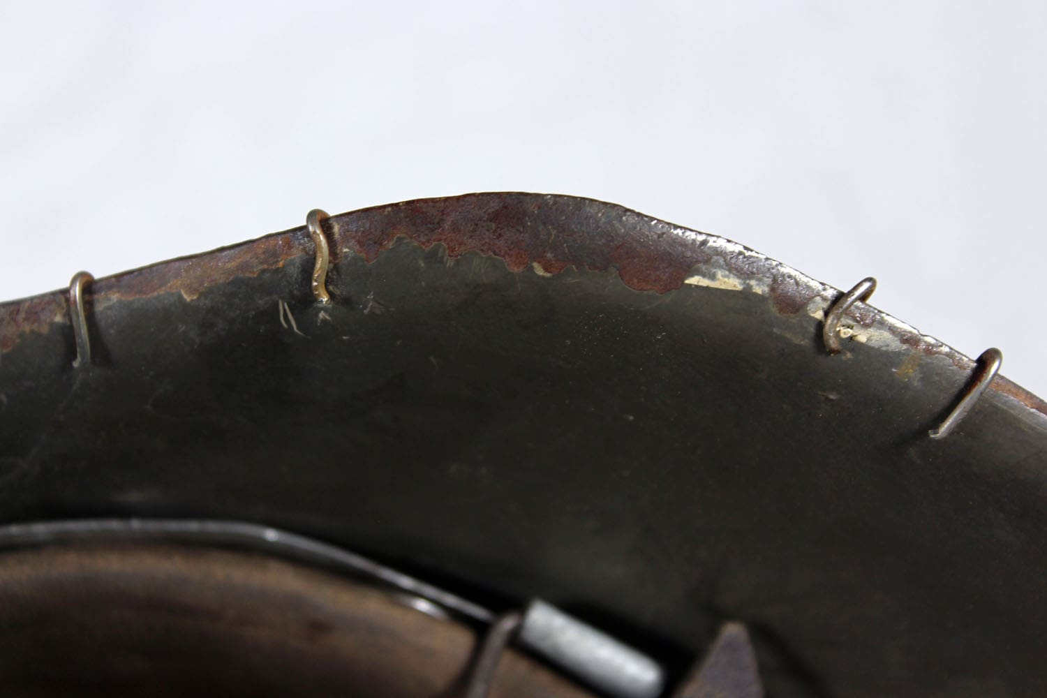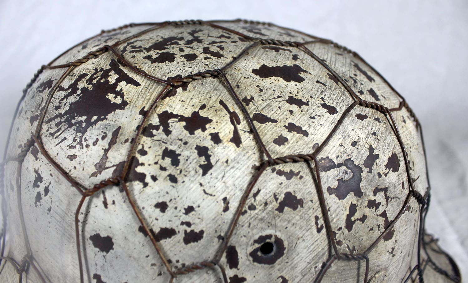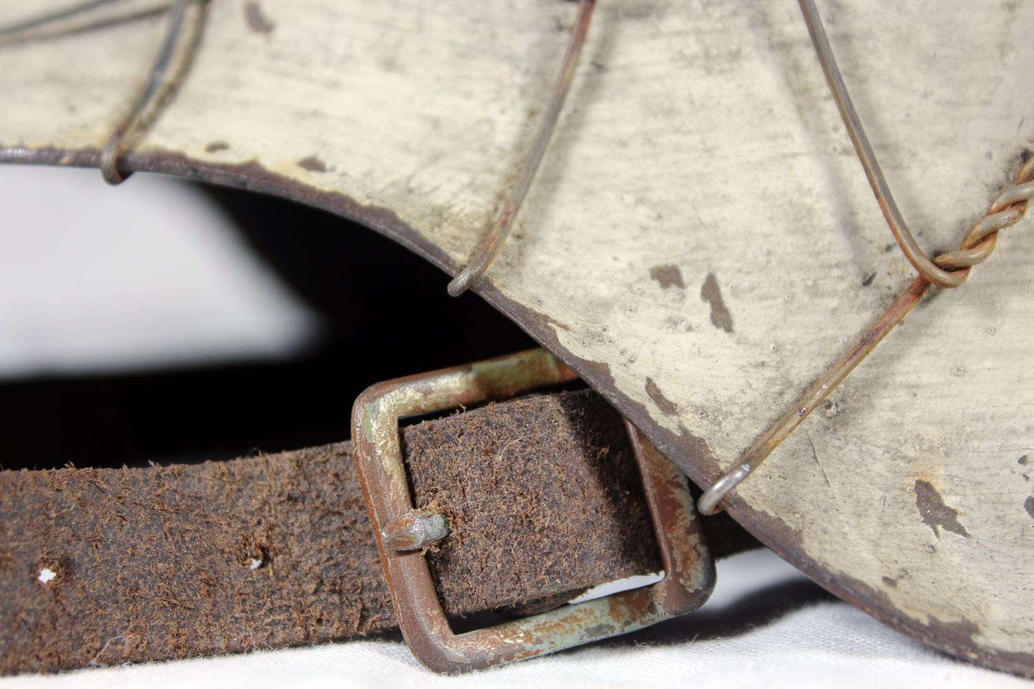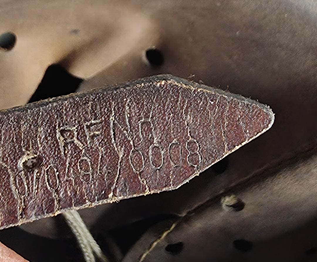 The helmet was fully stripped of post-war paint then repainted the correct shade of aluminum oxide textured field gray. The helmet was then fit with the proper war time steel liner, and 1944 dated split pins. The helmet’s chinstrap has original hardware and is RB marked. The restoration is meant to reflect the last winter campaigns of WWII such as the Ardennes or Bastogne. The snow camo was sloppily applied using a worn-out paint brush. The brush strokes are quite evident. A five-twist farm wire basket was then installed onto the helmet which would have allowed for pine needles or bits of cloth to be woven into the hexes for further camouflage.