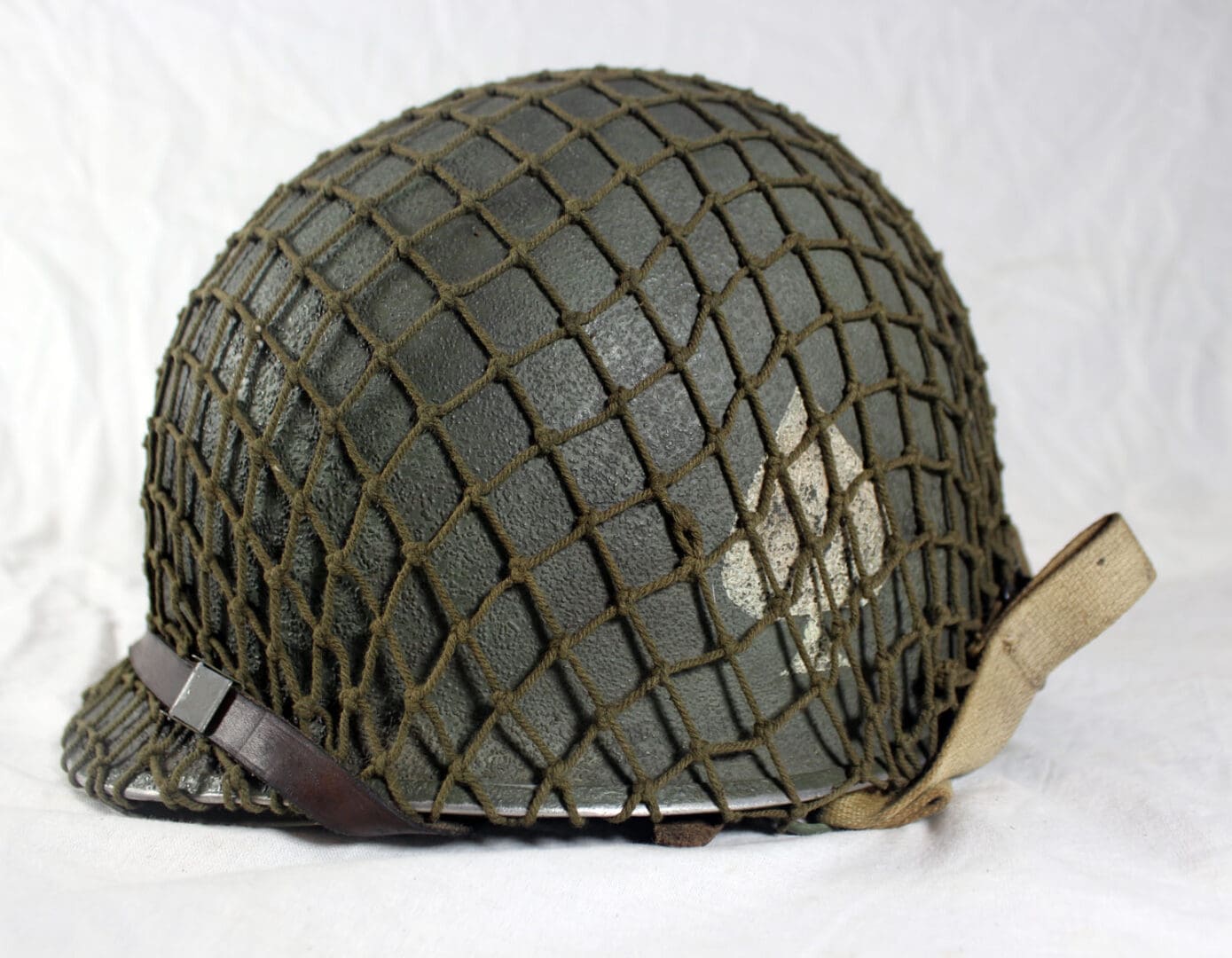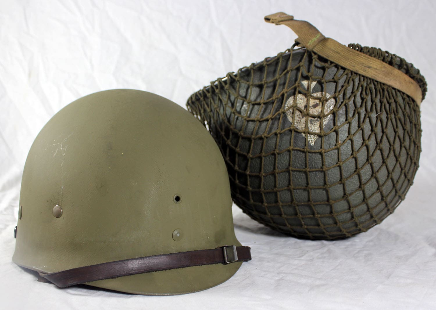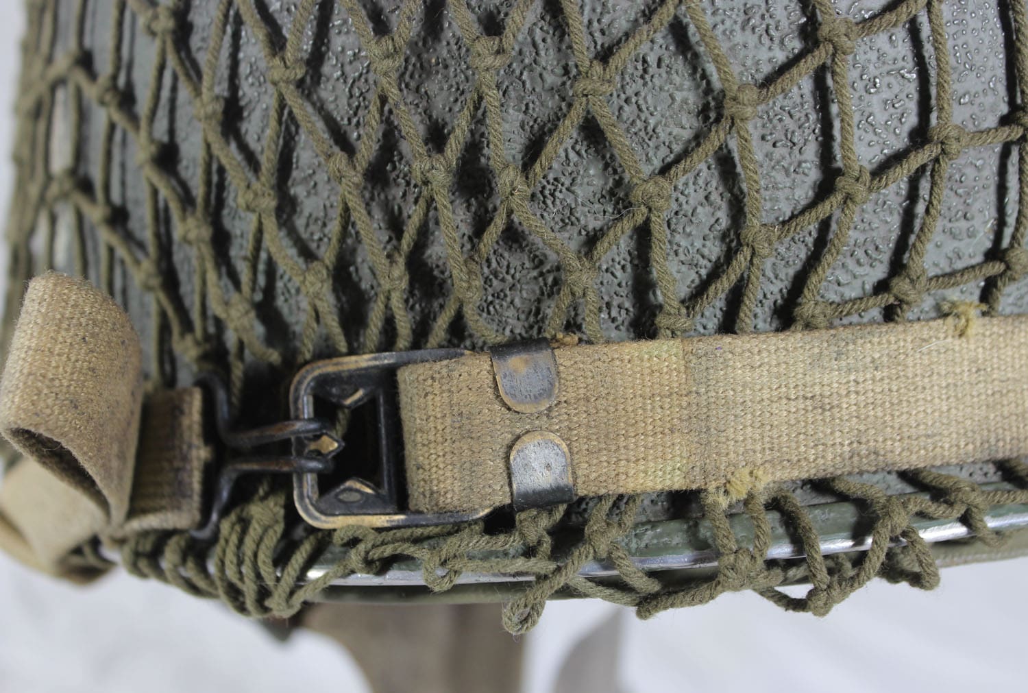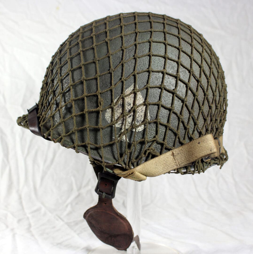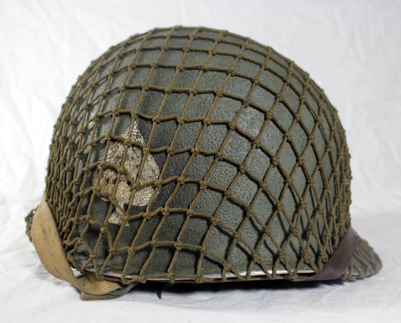 This restoration was inspired by helmets worn by member of the 506th Parachute Infantry Regiment during the Normandy drop. The 506th spade was applied by hand, in the large size used during Normandy. The helmet has been fit with a Westinghouse jump liner, which is the version many members of the 506th received prior to the Normandy jump. The look as been completed with a O.D. #7 net, which is one of two version used by the 506th.