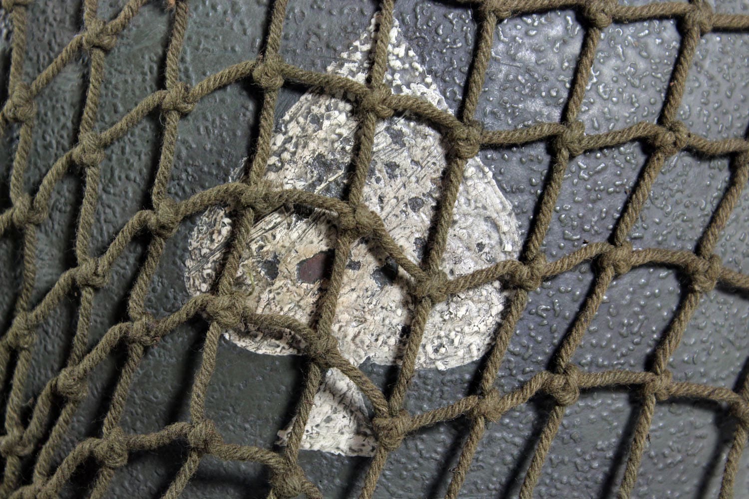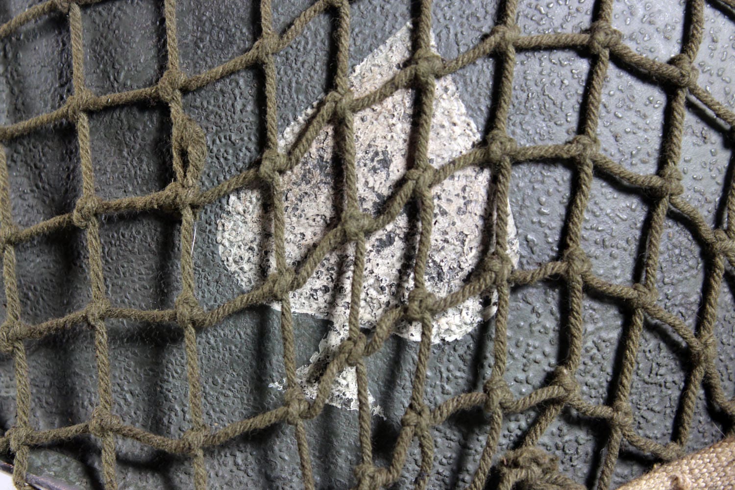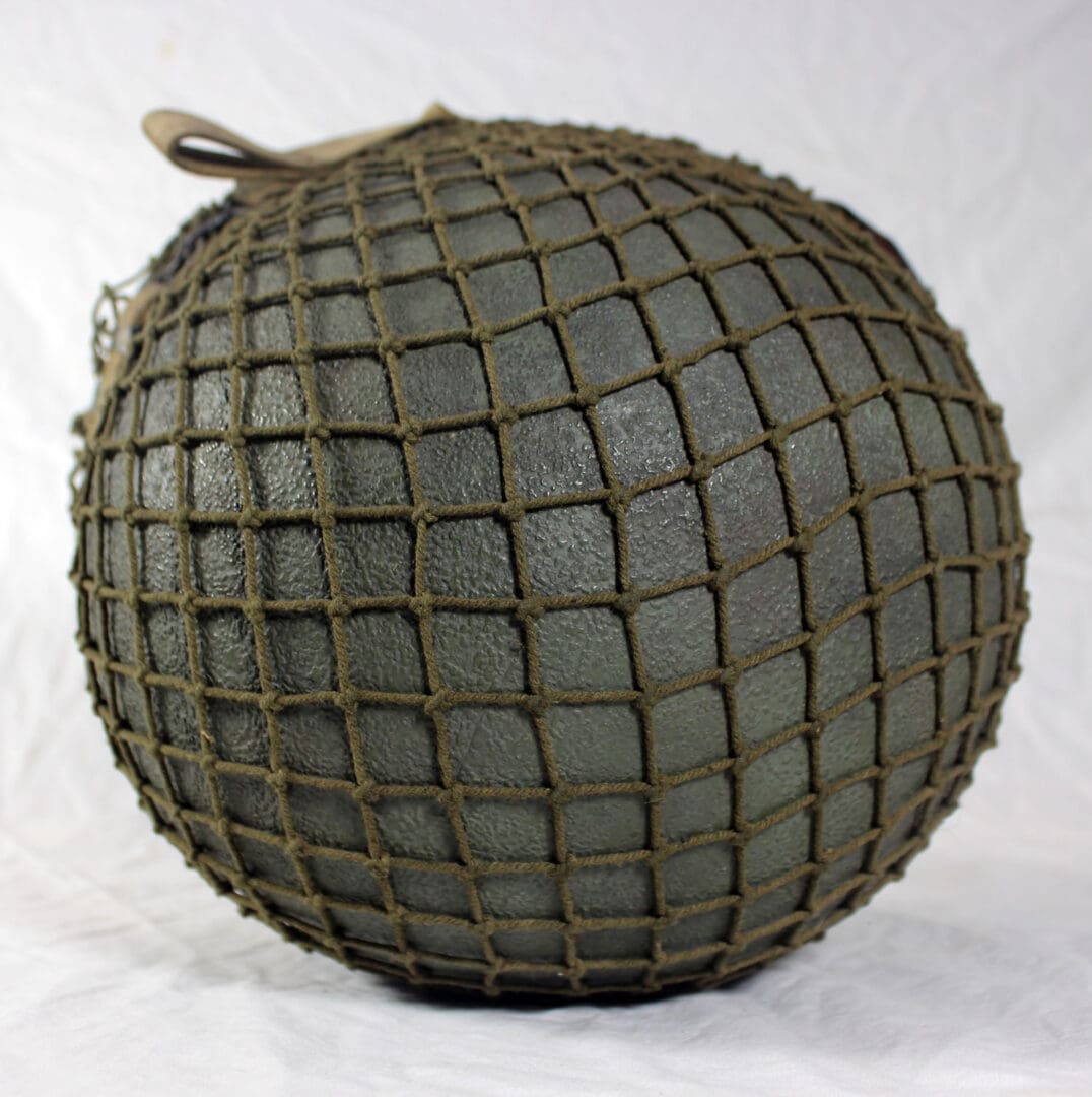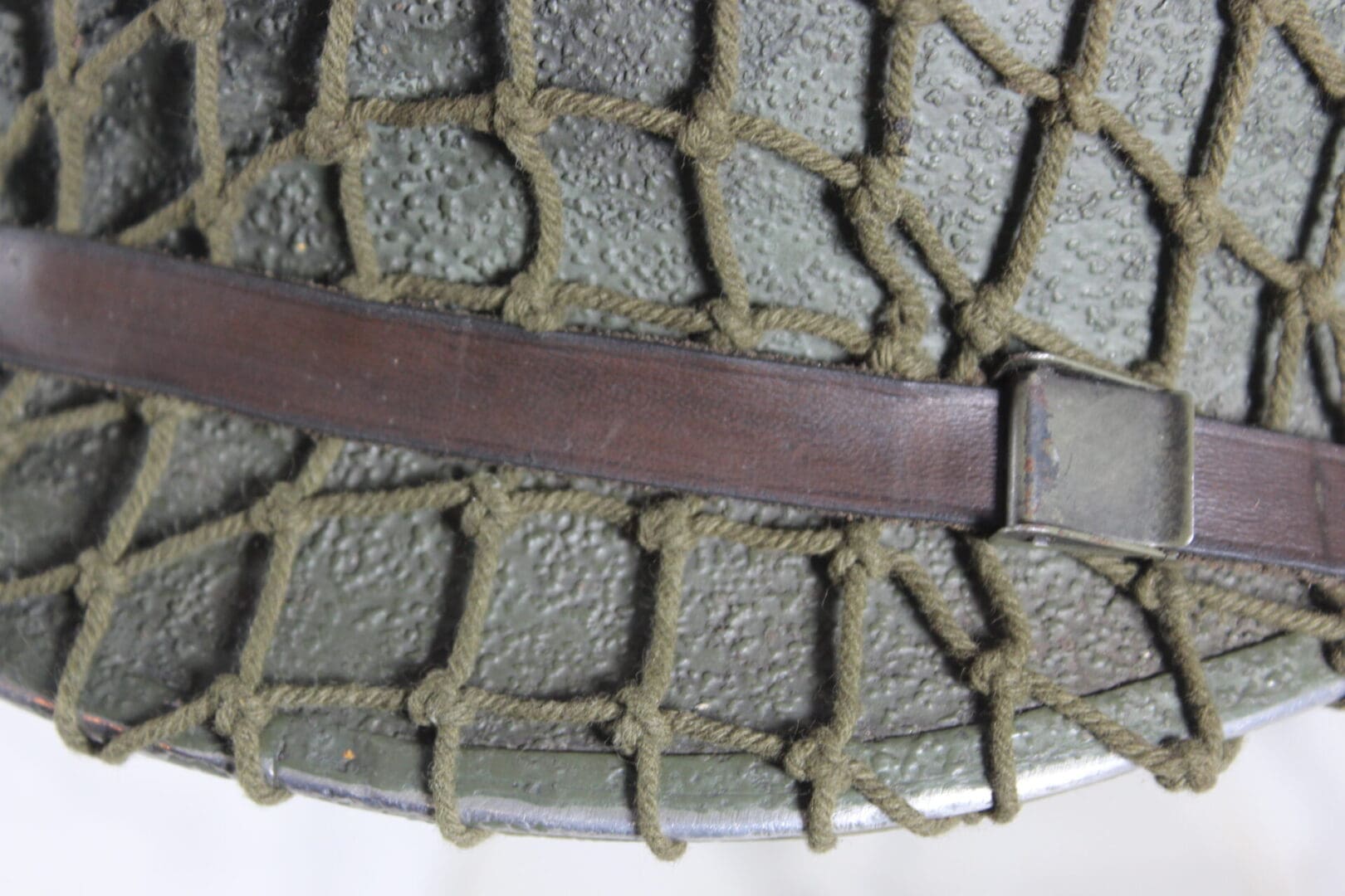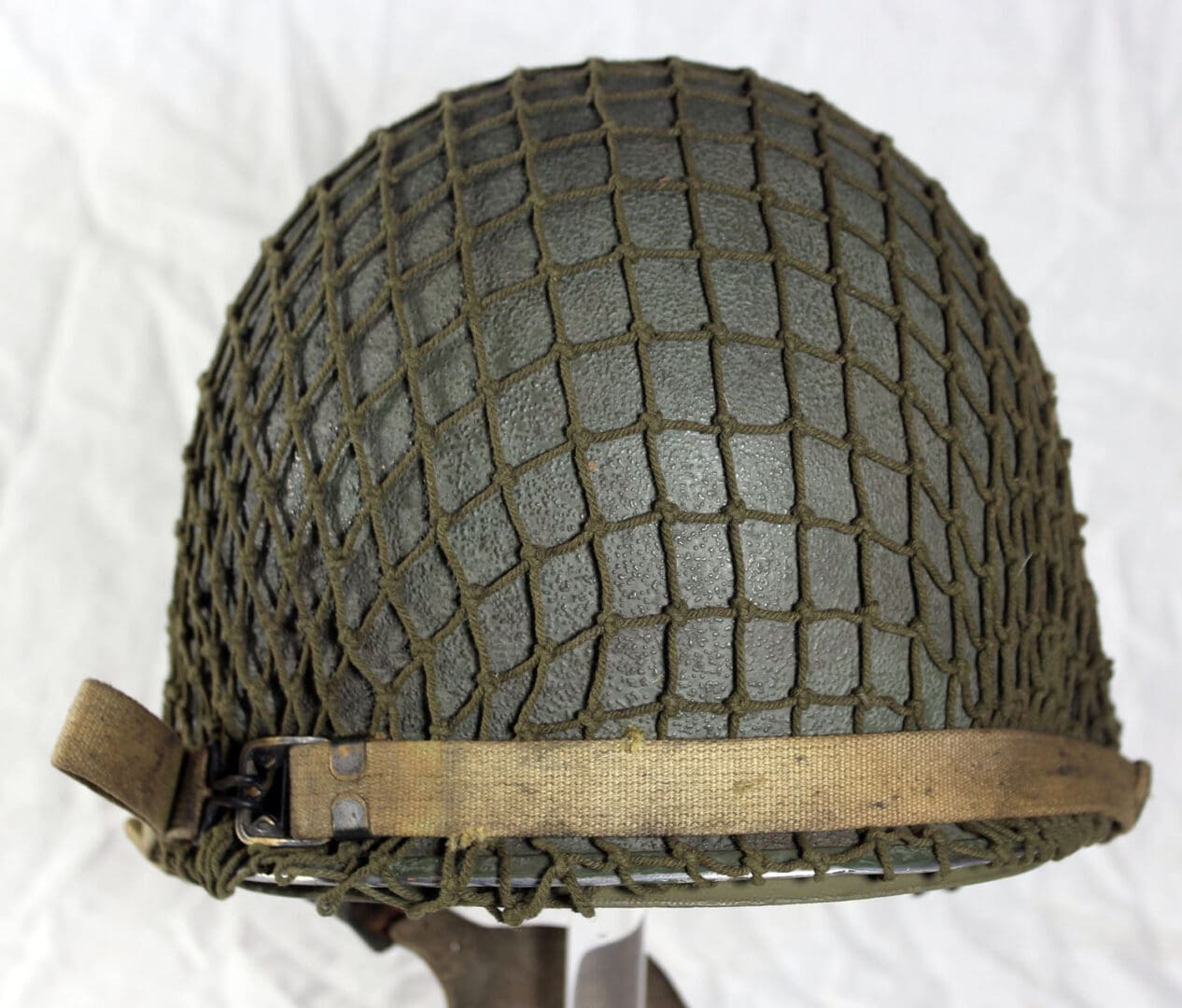 This restoration was inspired by helmets worn by member of the 506th Parachute Infantry Regiment during the Normandy drop. The 506th spade was applied by hand, in the large size used during Normandy. The helmet has been fit with a Westinghouse jump liner, which is the version many members of the 506th received prior to the Normandy jump. The look as been completed with a O.D. #7 net, which is one of two version used by the 506th.