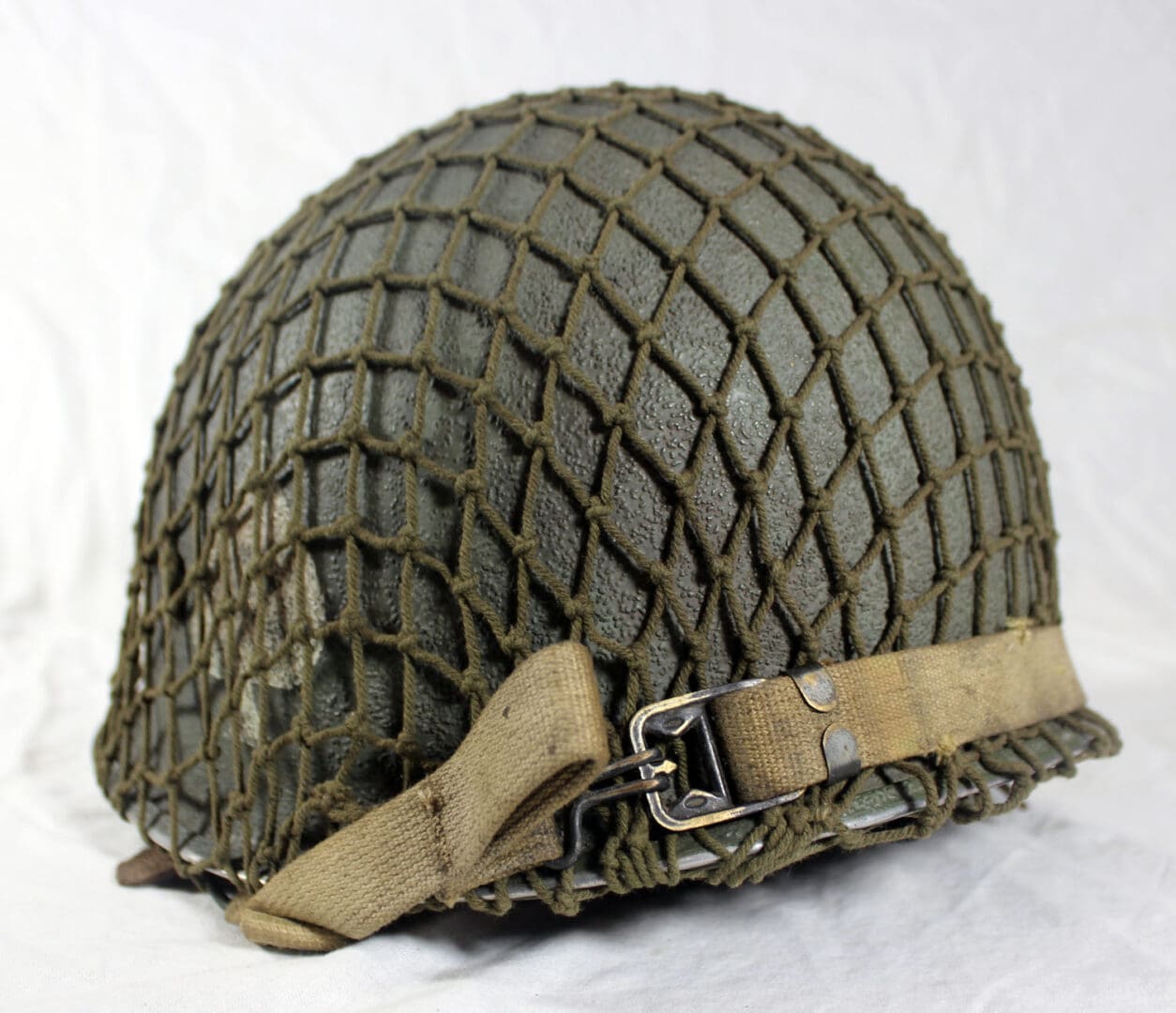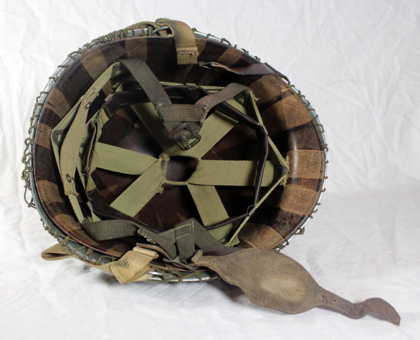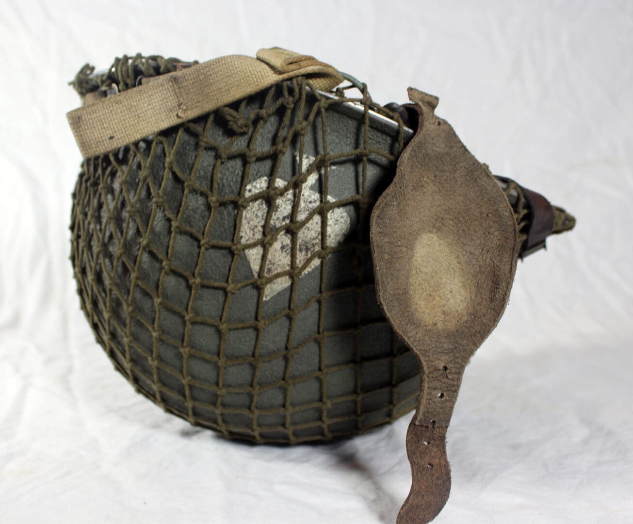 Restored US M2 helmet fit with a Westinghouse jump liner. The helmet has been distressed to look and feel like an original worn by the 506th PIR during the Normandy drop.
